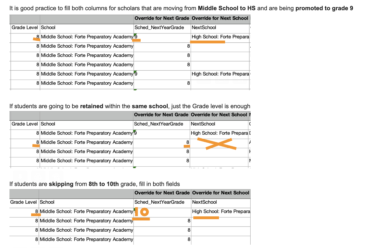 Another example: when a kid is moving up from Middle School to High School you will need to override both fields (input the first grade level of HS in the "Override for Next Grade" field and input the name of the HS in the "Override for Next School field").